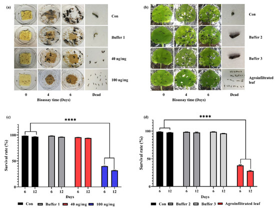 Insecticidal activity for S. litura using the recombinant Vip3Aa-treated-artificial diet and the Vip3Aa-agroinfiltrated plant leaf. (a) The recombinant Vip3Aa protein immersion artificial diet and (b) agroinfiltrated plant leaf were used for insect bioassay as feed for S. litura. The experiment was repeated five times. (c,d) Impact of Vip3Aa on the survival of S. litura on the artificial diet (c) and agroinfiltrated leaf-feeding (d) for 6 and 12 d. Number, feeding time (day); dead, dead insect; Con, mock; Buffer 1, PBS buffer; LC, Vip3Aa protein (40 ng/mg); HC, Vip3Aa protein (100 ng/mg); Buffer 2, infiltration buffer; Buffer 3, vector; leaf: Vip3Aa-agroinfiltrated leaf. Values are expressed as the means ± SEM. ****, p < 0.0001compared with the control.