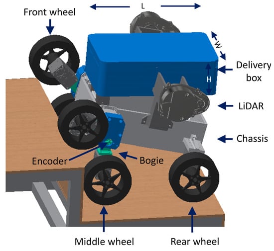The mobile robot design comprises a chassis, a box for the delivery package, and six wheels individually controlled by each actuator, as shown in Figure 1. The front wheel and the middle wheel are attached to a passive rotation joint that denotes by bogie and Link 1, which has a triangle shape formed by , , and parameters, where is the distance between the center of the front wheel and the center of the bogie. is the distance between the center of the middle wheel and the center of the bogie. is the distance between the front and middle wheel. The rear wheel is connected to the chassis forming an imaginary link between the center of the wheel and the bogie’s center called Link 2 and parameter.