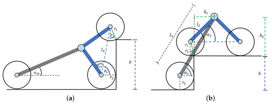 - The radius of the wheels , , and must be smaller than the parameters , , and , respectively, to avoid collisions between the wheels and parameters.