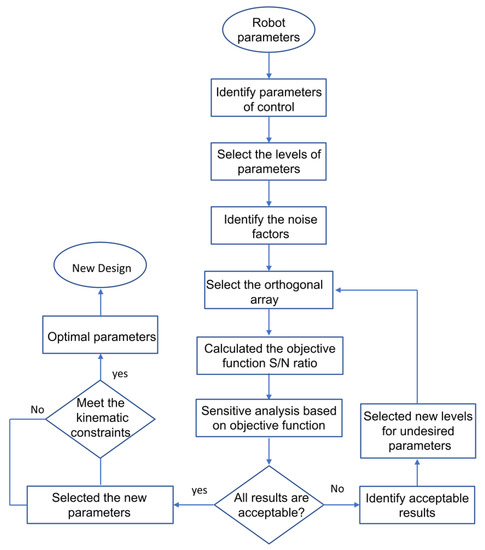 The robot design methodology proposed in this paper is described in Figure 4. The flowchart shows how the designer obtained the optimal parameters for the wheeled robots. We identify the parameters of control, which are the length of the links and the wheel radius. These parameters are changeable and evaluated to improve the robustness of the robot. We selected three levels of each parameter based on the kinematic constraints. The noise factor is a variable that cannot be controlled. For example, we do not know the height and the minimum step that the robot can find on its way. Then, we chose three different stair sizes as noise factors to ensure the robot could climb up and down different sizes of steps. We selected the orthogonal array according to the number of control factors and the levels. Then, we calculated the signal–noise ratio according to the objective function and obtained the sensitivity analysis. If the results show higher slopes between the levels of each parameter, it means we can select new levels and evaluate them again. We can select the best values based on the objective function if the slopes are minimums. Finally, if the new design parameters meet the kinematic constraints, they can be considered optimal design parameters.