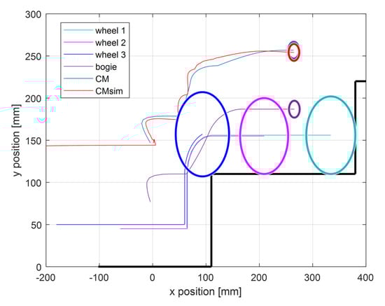 The trajectory of the wheels and the CM of the delivery package while the robot climbs one step of 11 × 27 cm.