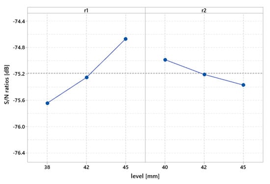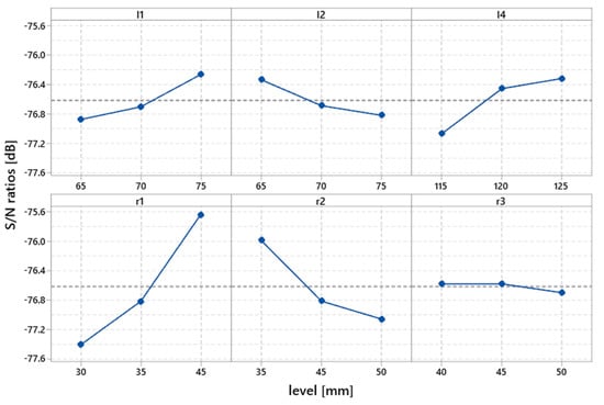The sensitivity analysis of the Taguchi method is shown in Figure 6. The six control factors are evaluated based on the objective function. Higher values in the S/N ratio mean optimal values of the design parameters. However, suppose the slope between the levels in each parameter is high. In that case, it means having large sensitivity. Then, it is recommended to prepare a second iteration with new levels in the parameters with high sensitivity in conjunction with the optimal values in the parameters with low sensitivity effects. The parameters , , , and have low sensitivity, and and have high sensitivity. From the first iteration results, we selected , , , and . For , even though 125 shows a higher value in (dB), we selected 120 based on kinematic constraints to reduce the length of the robot. For , the three values in (dB) are practically the same. Therefore, we decided to choose 50 because, during the descent of the 11 cm-high step, the rear wheel takes time to touch the ground, and the robot loses stability.