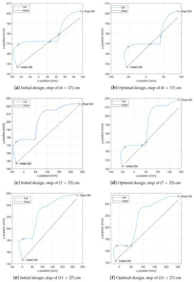 Figure 8 shows the area between the path of the center of mass and the slope of each stair. The results show satisfactorily that the area decreased with the optimal design. Figure 8a,b shows the robot climbing up one step of (6 × 17) cm, initial and optimal design, respectively; the area reduces from 1474 mm to 1227 mm. Figure 8c,d shows the robot climbing up one step of (7.5 × 25) cm, initial and optimal design, respectively; the area reduces from 5603 mm to 4828 mm. Figure 8e,f shows the robot climbing up one step of (11 × 27) cm, initial and optimal design, respectively; the area reduces from 8887 mm to 7624 mm.