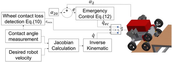 In previous research, the Jacobian matrices of each wheel and its inverse were obtained [13]. The measurement of the contact angle between the wheel–ground using 2D laser sensors allows obtaining the geometric information of the terrain and detection of the wheel-contact loss. This information has an important role in preventing the robot from falling during climbing up or down. Figure 10 shows the schematic control of the wheeled robot, including the emergency control when a wheel loses contact with the ground. We set the desired robot velocity according to the contact angle measurement from the LiDAR. We calculated the Jacobian and its inverse to obtain the angular velocity of each wheel , where , , and mean the angular velocity of the front, middle, and rear wheels, respectively. Therefore, the robot can follow the desired robot velocity.