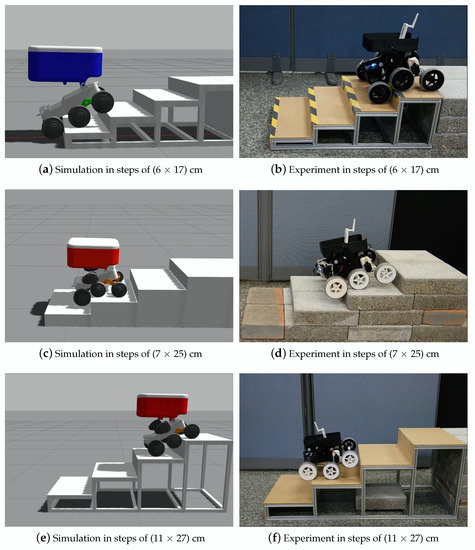 The 6-wheel robot was designed and optimized by the Taguchi method. Table 1 and Table 6 show the initial and optimized robot parameters. The simulation and experiments were carried out during climbing up and down steps of (6 × 17) cm, (7.5 × 25) cm, and (11 × 27) cm. The sensors for measuring the contact angle between the wheel–ground are encoders in each bogie, LiDAR sensor in each side of the robot, and IMU in the chassis. Each wheel has an independent actuator and one position-controlled motor in the chassis; To maintain the delivery package horizontal with respect to the ground, the IMU senses the rotation of the chassis. Then the motor rotates at the same angle in the opposite direction to the inclination of the chassis