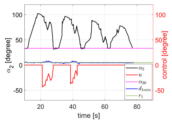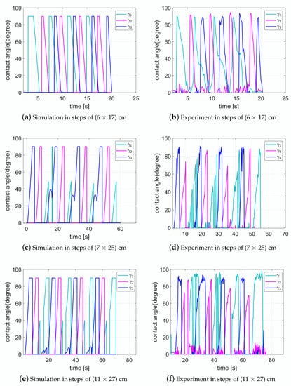 The case when emergency control work is when the front wheel loses contact with the ground. We detect this case using the contact angle method by the laser scanner sensor Equation (10). Figure 12 shows the contact angle between wheel–ground. The front, middle, and rear wheels are the lines colored cyan, magenta, and blue, respectively. In Figure 12a,b, the robot climbs up steps of (6 × 17) cm, in Figure 12c,d, the robot descends steps of (7.5 × 25) cm, and in Figure 12e,f, the robot descends steps of (11 × 27) cm. In Figure 12a,b, in simulation and experiment, it can be seen that the robot does not lose contact with the ground; for that reason, the lines are continuous. It can also be seen that when the robot is rising, the contact angle is 90 degrees. On the edges, it drops from 90 to 1 degree, and on the flat surface, it is zero degrees. Figure 12c–f) shows the descent of the robot on the (7.5 × 25) and (11 × 27) cm steps. The contact angle on the edge of the step goes up to 90 degrees, and when the wheel touches the vertical surface of the step, it is 90 degrees. The contact angle is zero when the wheel touches a flat surface or when it loses contact with the ground. In the second case, the emergency controller kicks in (Figure 13) when descending steps of (11 × 27) cm, where denotes the angle between and the global horizontal axis, this is the parameter controlled to prevent the robot from falling. The threshold is angle between and , is the distance the from the wheel to the ground, and the radius of the front wheel is and is the minimum value of should prevent the wheel from moving away from the ground. When is greater than , the emergency controller acts, and it is activated by reducing the value of to keep it at . Therefore, the robot maintains contact with the ground and descends safely. During climbing down the step of (11 × 27) cm, only in the first two steps, the front wheel loses contact with the ground, and we can see u is the control response to maintain at the initial position.