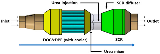 In the urea–SCR system, as the urea–water mixture sprayed from the urea injector installed in the reactor part is thermally decomposed by the exhaust temperature, HNCO is produced, and a hydrolysis reaction is generated in the reactor (mixed region) to produce an ammonia (NH3)-reducing agent. Exhaust gas containing ammonia then flows into the SCR through the diffuser, and ammonia causes an SCR reaction in the catalyst to convert NOX into harmless H2O and N2 [2]. Therefore, the flow uniformity of ammonia distributed at the front end of the SCR becomes an index capable of determining the reduction efficiency of the system. In addition, by calculating the pressure at the front end and the rear end of the system, the effect of the system on the output power characteristics of the engine can be determined in advance. However, these flow characteristics have limitations when analyzing them in an experimental method.