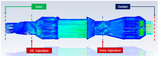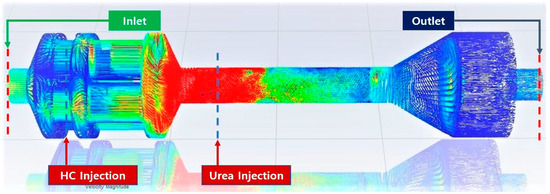 As a result of analyzing the flow velocity distribution, the flow velocity increased to about 55 m/s in DOC, and DPF made of porous media decreased to about 27 m/s immediately after passing through the filter, and then turbulent flow was formed by the mixer, and the flow velocity in the reactor section rose again to about 37 m/s. After that, the exhaust flow passes through the SCR composed of 16 square substrates. At this time, the average flow rate is 30 m/s, and then it passes through the outlet without a large change in flow rate.
