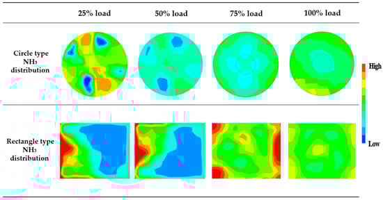 In the case of the circular type, there are no dead zones that are severely restricted by the flow such as with the rectangular type, so a relatively even distribution is shown, but when the flow velocity increases as the load increases, a phenomenon where a part of ammonia is locally concentrated on the wall surface appears. This can be seen as a result of relatively stagnant ammonia flow near the wall due to the result that the influence of friction acting on the wall increases with the increase of the flow velocity. The phenomenon where the ammonia concentration becomes thicker shows the effect of suppressing the SCR reaction, and thus shows a relatively low de-NOX performance in this region [18].