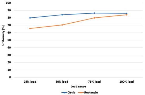As described in the introduction, when designing a single type of aftertreatment system for large generators, it is recommended to apply a system with a square substrate rather than a circular one for manufacturing reasons, since it is necessary to secure a cross-sectional diameter of 762 mm or more according to the specifications. Therefore, since it is expected to show different flow characteristics from the system to which the conventional circular substrate is applied, ammonia flow uniformity was compared at the front of the SCR according to the shape of each substrate to compare the difference in reduction efficiency between the rectangular and circular substrates. The flow area except the porous filter was designed in a circular shape to ensure maximum uniformity, and the urea mixer was designed in front of the injector to evenly mix ammonia in both systems.