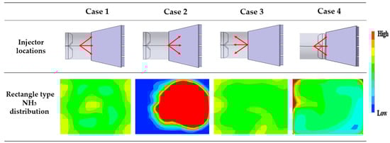 Four cases were interpreted: Case 1, where the injector is located as close as possible, Case 2, where the injector is located relatively far from the mixer, Case 3, where the positions of the mixer and the injector are reversed, and Case 4, where the injection direction is set as opposite to exhaust flow. Figure 7 summarizes the distribution of front-SCR ammonia by arrangement case of each urea injector for circular and rectangle systems.