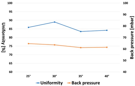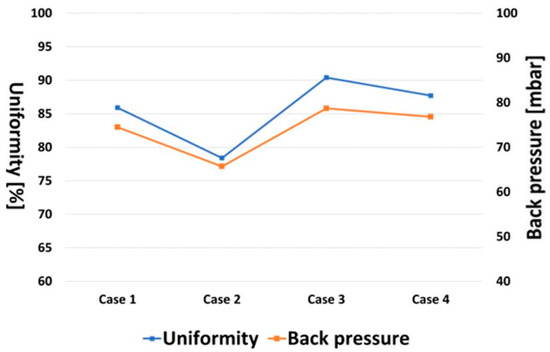 Figure 10 shows the change in flow uniformity and back pressure according to the enlarged tube angle. The change in flow uniformity according to the increase in angle appeared irregularly, but in the case of back pressure, it gradually improves. The diffuser angle showing the highest flow uniformity is 30°.