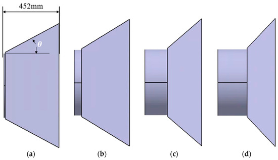 The diffuser provided at the front end of the SCR is provided for even distribution of ammonia by maximizing static pressure, which is a pressure acting in a direction perpendicular to the flow of the fluids. However, as the flow phenomenon occurs due to the difference in area between the inlet of the diffuser and the front end of the SCR catalyst, the flow velocity decreases rapidly, and in this process, secondary loss of flow occurs. Therefore, it is important to find an optimal angle to maximize ammonia flow uniformity while minimizing flow loss by analyzing the flow distribution according to the angle of the diffuser angle. To see the effect of the diffuser angle on the efficiency of the system, the total length of the entire system was fixed, and the magnifying tube angle was changed to 25°, 30°, 35°, and 40°. Figure 9 shows the enlarged diffuser angle model for numerical analysis, and the overall length of each model is the same.