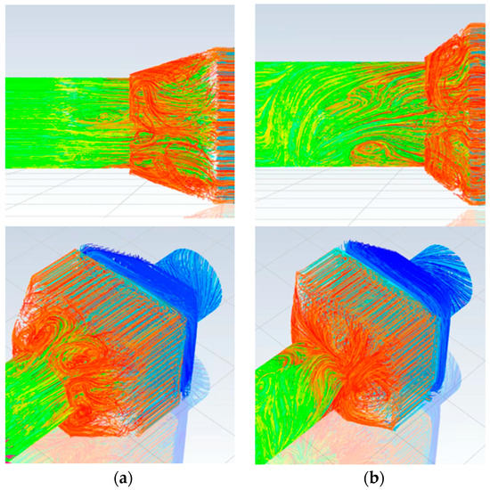 Path line at reactor, and diffuser with different angle: (a) 25°, (b) 40°.
