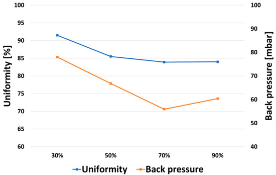 Figure 12 shows the change in flow uniformity and back pressure according to the change in porosity of DPF. As the porosity increases under the same conditions, the exhaust flow resistance generated when passing through the channel of the filter decreases and the back pressure decreases. At the same time, as the porosity increases, the flow uniformity tends to decrease.