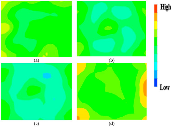 NH3 distribution with filter porosity: (a) 30%, (b) 50%, (c) 70%, (d) 90%.