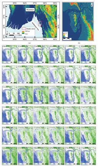 Experimental analysis was performed on datasets for the estuary of Salween River (Figure 1a). Salween River is one of only a few long free-flowing rivers in Southeast Asia, originating in the Tibet Plateau and emptying into the Andaman Sea in the Indian Ocean [34]. On the basis of Shuttle Radar Topography Mission (SRTM) data, Figure 1a,b show the location and digital elevation model (DEM) of the study area, an area of about . We used optical remote-sensing images acquired by Landsat series satellite from the summer of 1973 to the summer of 2020. Unfortunately, the majority of summer images included a large number of outliers in cloud-covered pixels. Clear-sky images that could be used for deriving NDVI are from winter. Table 1 shows the temporal and spatial extent of the experimental dataset. Data were divided into training and testing sets; the former was used to determine the values of algorithm parameters, while the latter was used to evaluate the performance of the proposed algorithm. In this article, we reconstruct outliers of summer NDVI on the basis of the above datasets.