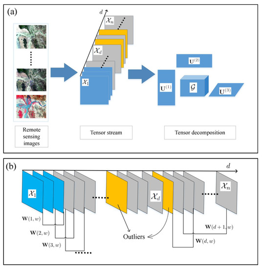 Tensor stream is a sequence of 3-order tensors , where each , d is an integer increasing with time [42]. According to this notation, a tensor stream was constructed from multitemporal optical remote-sensing image series. As shown in Figure 2, tensor corresponds to the image in the starting position of tensor stream, and tensor corresponds to the ending position. Thus, a tensor stream is formed by