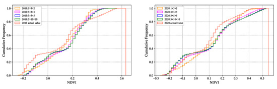 Cumulative frequency distributions of NDVI for actual and reconstructed values.