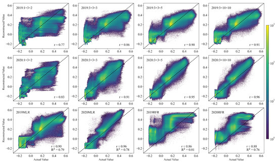 A plot of reconstructed against actual values shows that reconstructed values were closer to actual values with an increase in the number of ranks (Figure 5). Meanwhile, for most reconstruction results, the values of Pearson’s correlation coefficient (r) exceeded . The coefficient of determination () of MLR and RFR was around , which was considered unacceptable. Further, reconstruction results for 2020 were better than those for 2019 (Figure 3, Figure 4 and Figure 5), indicating that optical remote-sensing images from the same platform (Landsat-8) may obtain different results.