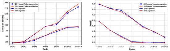 Figure 6 shows a quantitative evaluation of execution time and RMSE metrics of the proposed algorithm and the general Tucker decomposition method. First, our results showed that the proposed algorithm required less execution time and had a lower RMSE than that of the general Tucker decomposition method. Second, execution time increased with the increase in rank size. Meanwhile, the increase in execution time with Algorithm 1 was lower than that with the general Tucker decomposition method. Third, our proposed algorithm converged faster than the general Tucker decomposition method did in terms of RMSE. Additionally, the size of the core tensor influenced reconstructive results significantly. When the ranks of the core tensor increased to , RMSE exhibited a trend toward convergence. Generally, RMSE values obtained with Algorithm 1 in all experiments were less than , with the best RMSE was less than .