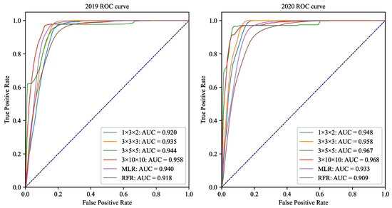 Actual and reconstructed values had a similar accumulation curve (Figure 4), and more than of actual and reconstructed areas overlapped. Meanwhile, cumulative curves with different rank sizes implied that the larger ranks of core tensor may not mean significant improvement in accuracy for reconstruction results. According to the evaluation metrics shown in Table 2, for most of the reconstruction results, values of accuracy, precision, recall, and score exceeded , which was considered to be acceptable. When rank sizes increased to , the values of kappa concordance coefficient corresponding to 2019 and 2020 exceeded and , respectively. In comparison with RFR, SWTSA has better accuracy and reconstruction capabilities. Moreover, Table 2 demonstrates that SWTSA and MLR had almost the same reconstruction effect corresponding to rank size of .