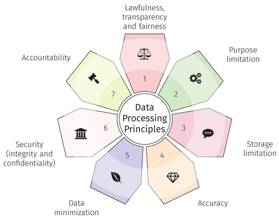 Any processing of personal data should occur in the light of the legal principles as set in the body of the GDPR subsequently illustrated in Figure 2. According to Article 83 Section 4 [7] of GDPR, any failure of the entities involved in the processing to comply with the data processing principles may result in administrative fines and other sanctions. Certainly, the adherence to these principles by the controllers seems to be a fundamental requirement for the assessment of their compliance to the GDPR. To that end, data should be processed with respect to the following principles [7]: