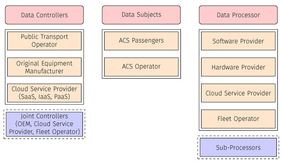 The analysis of the joint controllership is relevant to the ACS because many service providers may qualify as joint controllers, as Figure 3 shows. The public transport operators (PTOs), the OEMs, and cloud service providers may determine the means and data processing purposes of data collection and usage by the ACS. In actuality, in the light of the Facebook ID case, it was held that the notion of joint controllership exists even if the data are not personal. This statement extends the possibilities of joint controllership to other actors who process even anonymized data in the ACS. As far as the obligations and responsibilities, a clear arrangement among the data controllers should arrange the compliance to the regulation and the data subject’s rights. It should be noted that the decision about joint controllership may reveal that the very same of the above stakeholders may act as joint controllers in the event of commonly determining the means and purposes of processing. In other cases, though, this interaction concerns a party that processes personal information on behalf of another while both parties may have been involved in joint operations that precede or are subsequent in the overall chain of processing [41].