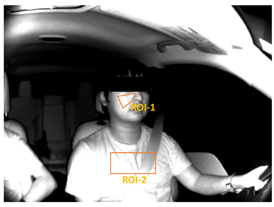 Our system extracts HR using both the average grayscale intensity and depth of ROI (Region of Interest)-1 on the right cheek region while measuring RR with just the average depth information of ROI-2 on the chest. Compared to our previous study [28], the ROI-1 is selected based on the need to adapt to more complex scenarios and the mounting angle of the camera. We only select the smooth region on the right cheek so that the signal is less likely to be affected by the facial hair or the uneven shape of the face. To adapt and track ROI-1 and ROI-2 (Figure 2) from various head poses and seating positions that users could potentially take in a car, a more sophisticated face mesh detection algorithm is used [35] to extract 468 facial landmarks (compared to the 66 landmarks used in [28]) from the user’s face. The landmarks that encircle the right cheek/nose area are selected as the corner points of ROI-1. After the facial landmarks are extracted, we apply a pose estimator to find the shoulder of the user and define the ROI-2 on the chest using the relative positive between the jawline and the shoulder. When the user sits 50 cm from the ToF camera, ROI-1 contains roughly 500 pixels while ROI-2 contains roughly 8000 pixels.