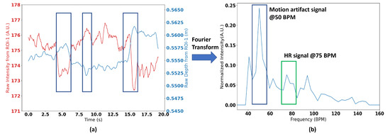 (a) Raw intensity (red) and depth (blue) captured by the ToF camera. Depth change induced by motion (blue rectangle) is inversely proportional to the intensity, which is a key source of erroneous HR reading. (b) When motion artifacts are present, they create artifact frequency components that overwhelm the actual HR signal.