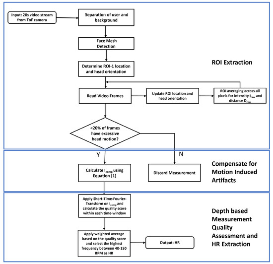 In this study, HR is extracted in three major steps (Figure 4): 1. Extract average grayscale intensity and depth information from ROI-1; 2. compensate for motion-induced intensity artifacts using depth information; 3. use depth information to assess the HR signal quality in different sections during the 20 s video and extract HR from the processed signal. Because the user in a moving vehicle will encounter more random motion, compared to the previous study [28], step 3 is added to further differentiate signal sections with more motion interference from signal sections with less motion interference.