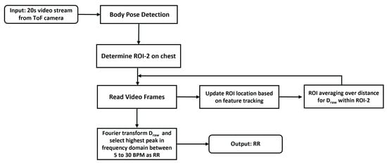 Furthermore, even though RR has been shown to be correlated with the drowsiness or stress level of the driver [8], the existing camera-based system usually does not have an adequate signal quality to extract RR from the HR signal [29,30]. To circumvent the limitation of low signal quality, in this study, we use the ToF camera to measure RR directly by measuring the chest wall displacement [28,31], avoiding the potential complexity of fusing the data from the radar sensor and the camera, respectively, and reducing the cost for the entire system.
