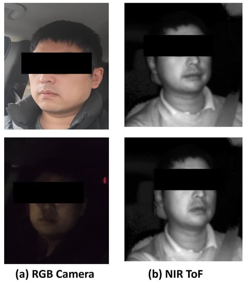 One advantage of using the ToF camera is that the 850 nm active illumination provided by the VCSEL allows the system to operate independent of the ambient light conditions. Such benefits can be attributed to both the bandpass filter as well as the underlying lock-in detection schematics of the indirect ToF camera [34,37]. Figure 6 shows the images seen by the ToF camera in both bright and dark environments. In the bright environment, the brightness level in the cabin exceeds 1800 Lux, while in the dark environment, the brightness level is less than 5 Lux.