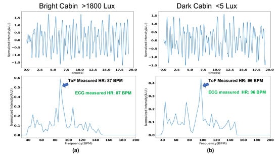 In both bright and dark environments, the images seen by the ToF camera are very similar, and HR can be extracted in both cases (Figure 7).