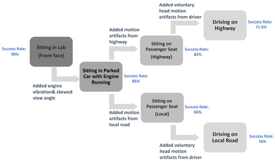 Figure 8 shows a waterfall chart of the success rate tested under each of the scenarios (Table 2). An HR measurement from our CVSM system is defined as ‘successful’ if the measurement is within 10% of the HR measured by our reference device, a Polar H10 chest strap. The success rates of HR measurements on highway conditions outperform the success rates on the local road conditions in all cases. Such results are expected since the local road represents a more complex driving scenario. Compared to a highway, local roads have more potholes and busier traffic, which leads to more frequent active and passive motions of the driver. With the adding of more potential sources of motion artifacts in each consecutive scenario, we can see a degradation of HR measurement performance by different amounts. In the case of the highway scenario, the success rate drops from 90% when measured in the lab to 71.9% when the driver is driving the vehicle on the highway, with the most significant performance drop occurring when we add the voluntary head motions from the driver (i.e., the case when driver drives the car him/herself). As a comparison, the success rate drops to a lower 56% when the driver is driving on the local road. However, the most significant decrease in performances for the local road scenarios seems to arise from the road surface and traffic conditions rather than the driver’s active motion (the success rate drops most when we started to measure passengers in a moving vehicle). In reality, the highway scenario will be the more important use case for the CVSM system, due to higher speed as well as the longer time of driving, leading to drowsiness and potentially more catastrophic accidents [38]. We will discuss in detail the system performance under each in-vehicle scenario in the following paragraphs.