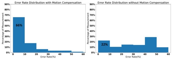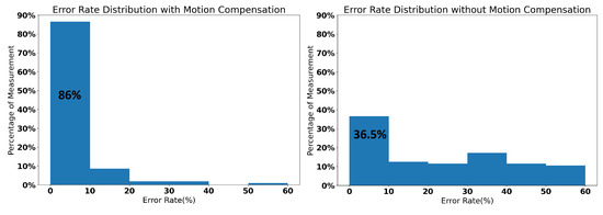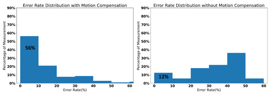 HR measurement error rate when participants sit in the passenger seat on the highway with motion compensation (left) and without motion compensation (right).
