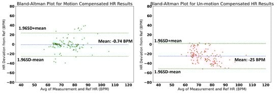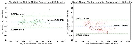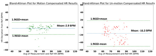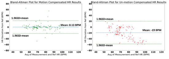 Figure 10 shows the Bland–Altman plot of the HR measurements in the parked vehicle with the engine running. With depth-based motion compensation enabled, the mean deviation of the HR measurements from is −2.9 BPM and 95% of the measurement deviations fall between ±19.6 BPM of the mean deviation. When depth-based compensation is not used, we observe a much higher negative bias of −16.3 BPM with 95% of deviation falling between ±35 BPM of the mean. Such larger bias is usually caused by the lower frequency motion artifacts being mistakenly recognized as HR.