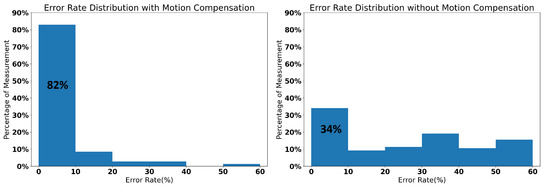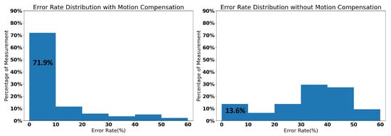 HR measurement error rate when participants drive on a local road with motion compensation (left) and without motion compensation (right).