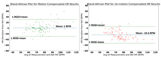 Bland–Altman plot of HR measurements when participants drive on a local road with motion compensation (left) and without motion compensation (right).