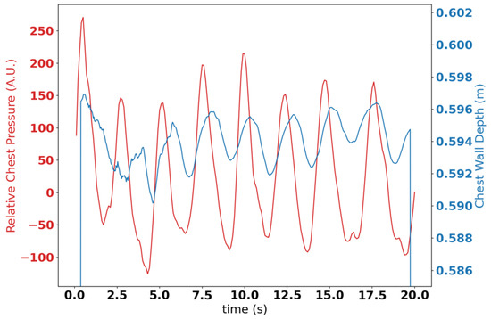 In this study, RR is also measured on participants while driving on the highway. Figure 19 shows typical respiration motion acquired on the chest region compared with the reference chest belt on the highway. The ToF camera measures a typical chest wall depth change of ±2 mm, with the pattern matching the pressure change measured by the reference respiration belt.