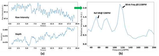 Periodic reflection from participant blinking could affect the location of the ROI-1 as a result of jitter. The jittering can lead to additional intensity artifacts that will not be captured by the (a) depth signal, leading to erroneous HR reading from the (b) frequency domain.