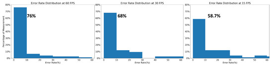 Moreover, a unique challenge to monitoring HR in a vehicle is the sudden motions from either the driver/passenger or the road conditions. In order to capture these motions accurately, it might be beneficial to use a camera with a higher frame rate. To investigate the potential benefits of using a higher frame rate camera, we measured HR on three participants while driving on the highway at 60 FPS (compared with 30 FPS in the experiment section). The acquired 60 FPS videos are then down-sampled (only using every other frame in the original video) to 30 and 15 FPS to compare the performance of HR measurements at different frame rates. Each frame in the 60/30/15 FPS video shares the same integration the time and, therefore, the same background noise. Figure 22 shows the error rate distribution for the HR measurements on the highway. With a higher frame rate (60 FPS), the motion across two consecutive frames is smaller, which makes tracking the ROI easier when sudden or large motions are present. In our preliminary test, the original 60 FPS videos result in a success rate of 76% while the down-sampled 30 FPS videos leads to a reduced success rate of 68%. When the frame rate is further reduced to 15 FPS, a further degradation of the success rate to 58.7% is observed.