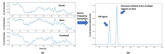 (a) Grayscale signal from three different ROIs on the face captured with the VCSEL illuminated ToF camera, showing similar patterns of artifacts among all three ROIs. (b) Extracted sparse frequency component using the method in [11], showing both HR and artifact frequency components.