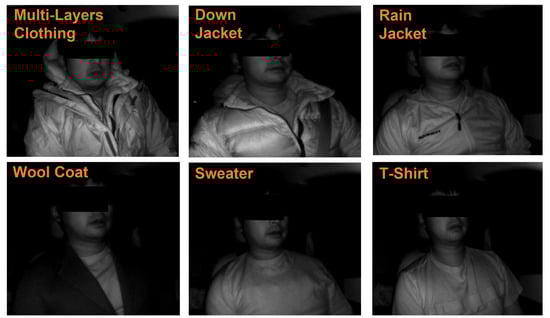 Regarding using a ToF camera for RR measurements, a natural question to ask is how would different types of clothing (that could block or dampen the motion of the chest wall) affect the performance of RR measurement using the ToF camera. Even though the ToF camera offers the capability of directly measuring RR similar to a millimeter-wave radar, one drawback is that the 850 nm light cannot penetrate clothes compared to the millimeter wave used in radar. To test the effect of clothing, we measure the depth change on ROI-2 while the participants wear clothes of different degrees of thickness (Figure 24). Fortunately, in all cases, even including the case of a thick down jacket, we were able to detect the chest wall motion from respiration in various commonly worn clothes (Figure 25). Only when the participant is purposefully wearing multi-layer “puffy” clothes with air gaps in between did we start to see the errors of RR measurements increasing, as the puffy clothing can block the chest motion from the camera (Table 4). Finally, it should still be noted that the typical amplitude of the chest motion is only ±2 mm, and the RR is derived solely from the depth data. In the existence of large external motion, it is still possible for the excessive motion to corrupt the RR measurements. Such limitation could be mitigated by adding complementary RR measurements methods such as RR extraction from HR variability or through extra sensors such as thermal cameras that are co-equipped in the vehicle [20,21,29].