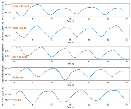 Respiration motion on chest measured by the ToF camera while the participants were wearing different types of clothing. Clear respiration patterns can be seen in all cases.