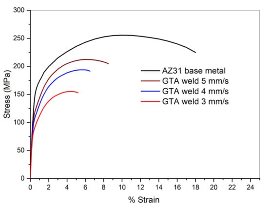 - Subravel, V.; Padmanaban, G.; Balasubramanian, V. Effect of Welding Speed on Microstructural Characteristics and Tensile Properties of GTA Welded AZ31B Magnesium Alloy. Trans. Nonferrous Met. Soc. China 2014, 24, 2776–2784. [Google Scholar] [CrossRef]
