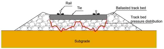 Railway ballasted track is one of the most-often constructed track types in urban railways, general railways, and high-speed railways. The ballast used as track bed material consists of crushed gravel with a size of 4–5 cm, and has been used since the beginning of railway history 200 years ago. Approximately 80% of railway tracks in South Korea are ballasted tracks. Ballasted tracks transmit load from the rails and ties to the subgrade during railway vehicle travel and feature good drainage, as shown in Figure 1.