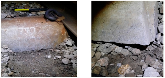 In tracks where railway vehicles travel, the ballast pieces are deformed by the vibrations caused by the railway vehicle load, and these tracks have the structural property of progressive track irregularity. When the wearing and crushing of the ballast is accelerated and the ballast is damaged by repetitive railway vehicle operation and track repair work, as shown in Figure 2, the track’s support capacity is reduced, and track irregularities occur due to fouling. In addition, if the ballast directly below the ties becomes pulverized, it can cause the track bed to solidify by mixing with the soil [1,2]. When rainwater and freeze–thaw cycles act upon the track bed, mud-pumping occurs due to poor drainage, and the track bed becomes polluted.