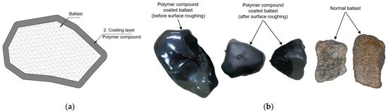 Comparison of normal ballast and coated ballast: (a) Coated ballast cross-section. (b) Comparison of coated ballast and normal ballast before and after surface roughing.