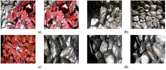 Ballast before and after laboratory experiments: (a) normal ballast (300 mm), (b) coated ballast (250 mm), (c) normal ballast (150 mm) and coated ballast (150 mm), (d) coated ballast (100 mm).